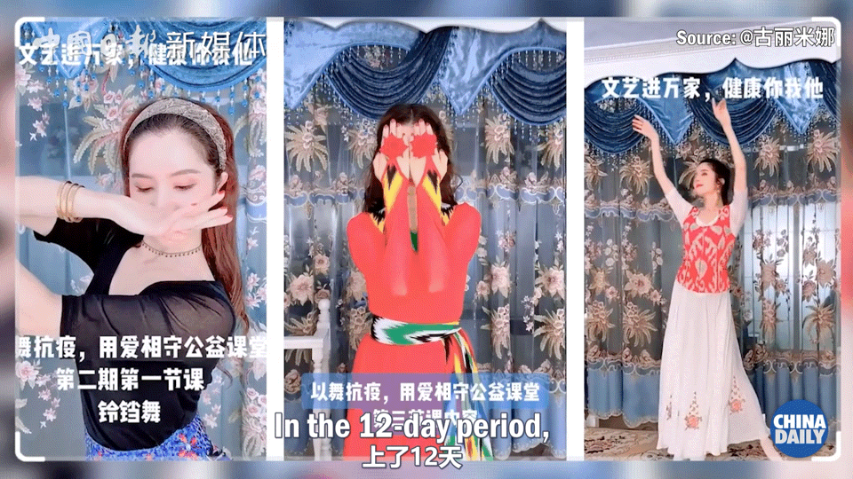我是什么时候感受到大家对新疆的这种民族舞蹈的热爱,是我在疫情期间,在抖音开播了公益舞蹈课堂。当时我每天就直播一个小时, 上了12天,有一百多万人参加。
