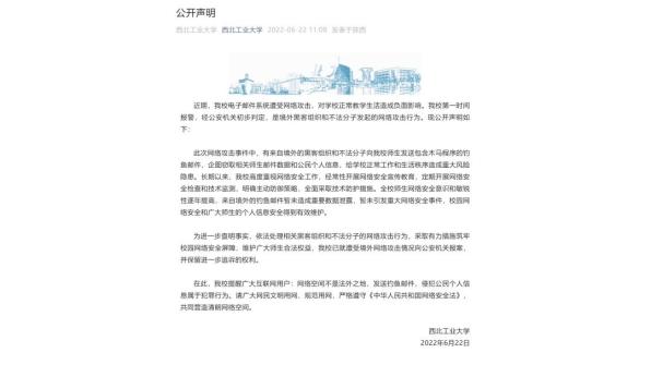 今年6月,西北工业大学发布《公开声明》称,西北工业大学电子邮件系统遭受网络攻击,有来自境外的黑客组织和不法分子向该校师生发送包含木马程序的钓鱼邮件,企图窃取相关师生邮件数据和公民个人信息。