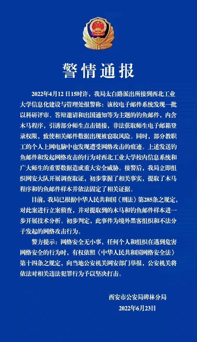 西安市公安局碑林分局随即发布《警情通报》称,“我局已根据中华人民共和国《刑法》第285条之规定对此案进行立案侦查,并对提取到的木马和钓鱼邮件样本进一步开展技术分析。初步判定,此事件为境外黑客组织和不法分子发起的网络攻击行为。”