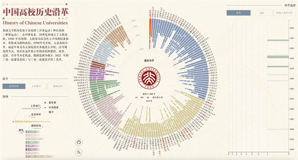 首先映入用户眼帘的是一个外对齐的圆环。作为高校历史的概览,每一个扇形条带为一个高校,其长度代表了高校的建校时长,越长的条带表示越长的历史,和时间轴对齐。其颜色与高校的类型(综合类、理工类、师范 / 语言类、农林类、财经 / 政法类、军事类、医药类、民族 / 艺术 / 体育类)相对应。根据用户的需求,院校可以按照类型、主管部门或建校日期等准则排序。鼠标悬浮时,中心会展示高校的 Logo、建校事件、主管部门、当前校址等信息。其中,高校主管部门的类型信息也编码在了圆环外侧、名字内侧的符号中,详见左下角的图例。