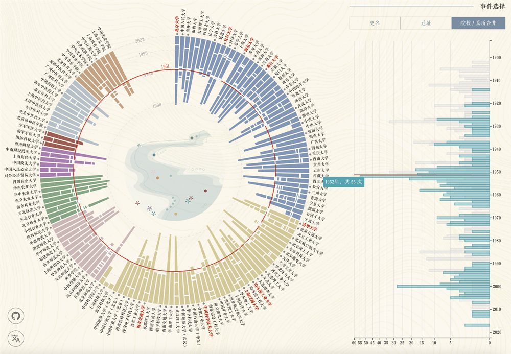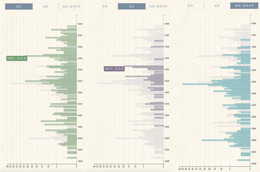 从右侧的事件统计视图中,我们可以看到院校的更名、迁址与合并事件的频率趋势。