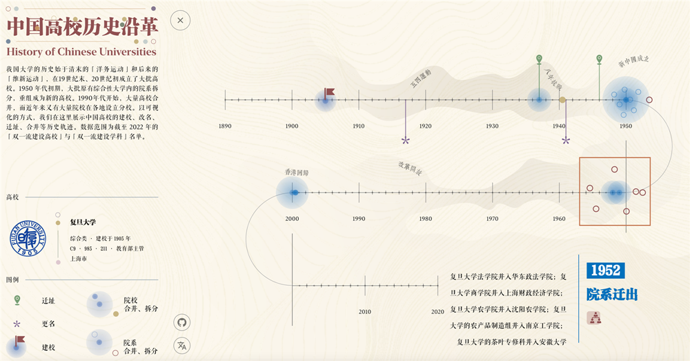 在圆环中点击高校,进入高校的历史详情界面。以河流为背景,我们在时间轴上用不同的符号标记了不同的事件。鼠标悬停在不同符号上时,右下角会展示事件的时间与详情。对于院校或院系的合并与拆分,我们用半透明的圆圈表示高校自己,小的圆圈表示迁入 / 迁出的单位(高校或院系。透明圆圈内部的圆圈个数代表了迁入的单位个数,圆环外部的个数亦然。例如下图 1950 年的标记(矩形框内)表示了复旦大学在 1950 年发生的一系列院系迁出事件。