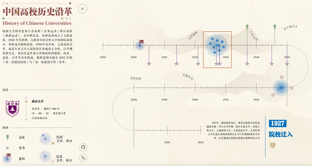 我国现代高校的历史起源于清末的「洋务运动」和后来的「维新运动」。19 世纪末 20 世纪初,大批高等院校成立。在 20 世纪上叶伴随以抗日战争为核心的历史事件发生了相对集中的迁址、改建等事件。新中国成立后,1950 年代初期,大批原有综合性大学内的院系拆分,重组成为新的高校。1990 年代起,高校频繁发生合并、重组等架构变化,而近年来又有大量院校在各地设立分校。以可视化的方式,我们期望展现中国高校的建校、改名、迁址、合并等历史轨迹,描绘中国高等教育发展的蓝图嬗变。