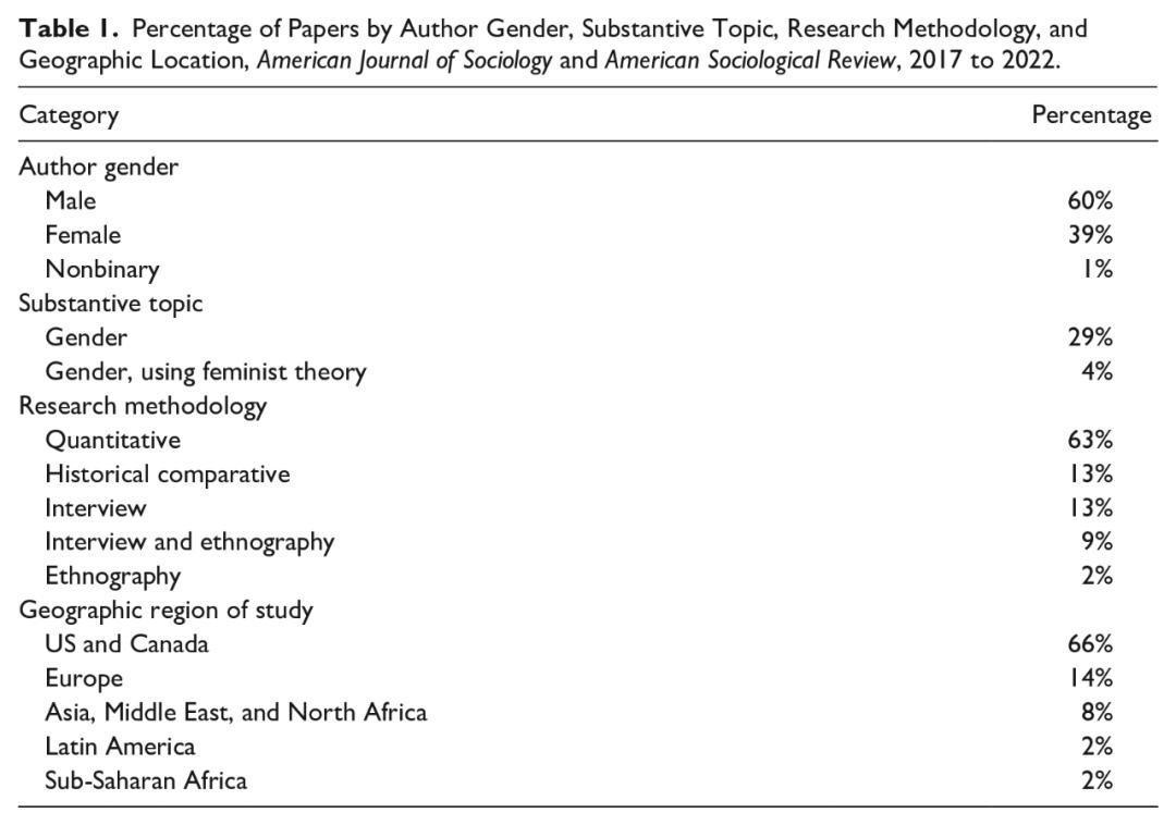 数据显示,主流期刊似乎正在缩小作者之间的性别差距,60%的论文由男性发表,39%由女性作者发表,1%由非二元性别作者发表。此外,29%的论文是关于性别的。然而,只有14%的关于性别的文章(或所有文章的4%)涉及到女权主义理论。这些数据似乎证实了早期学者的假设,即只有“特定类型”的性别主题论文才能进入主流。我们必须问,对于我们学科的顶级期刊来说,什么才算得上是“一般社会学”。