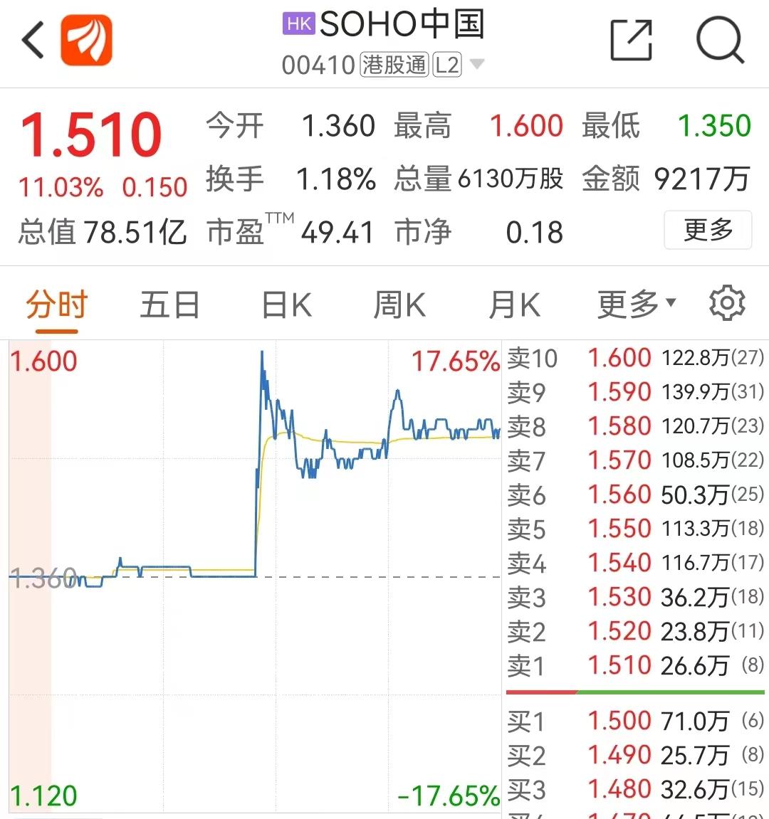受此消息影响,SOHO中国股价瞬间飙涨近17%,随后稍有回落。截至当日收盘,SOHO中国股价涨幅达11.03%。