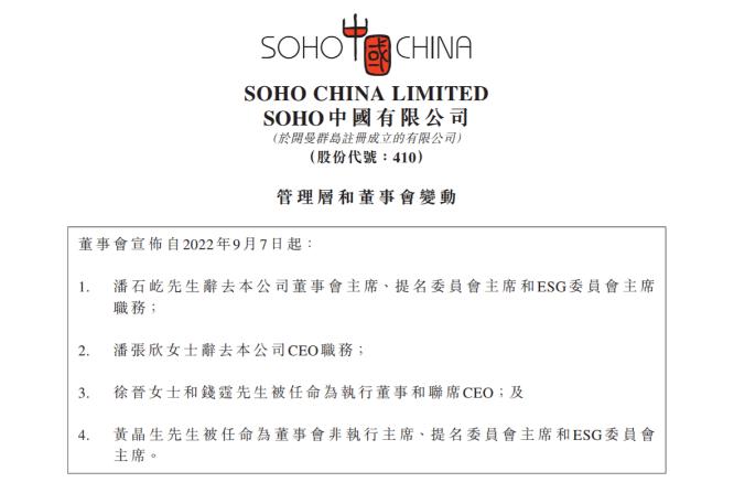 9月7日午间,SOHO中国公告称,潘石屹已辞去董事会主席、提名委员会主席和ESG委员会主席的职务,以专注于支持艺术和慈善事业;潘张欣已辞去公司CEO的职务,以专注于支持艺术和慈善事业。公告称,徐晋和钱霆被任命为执行董事和联席CEO,黄晶生被任命为董事会非执行主席、提名委员会主席和ESG委员会主席。