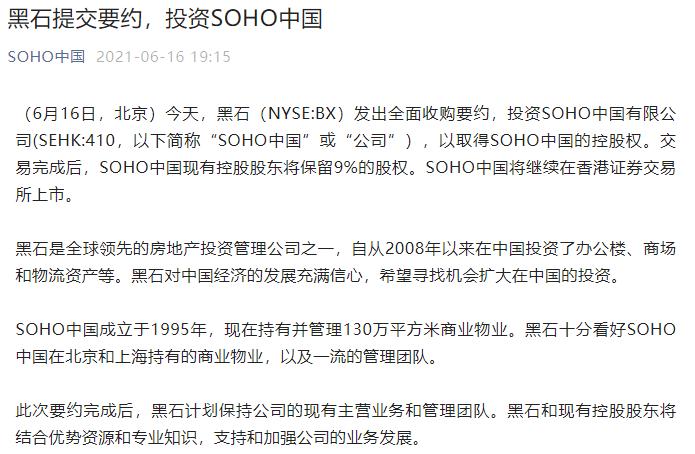在被立案审查一个多月后,2021年9月10日,SOHO中国宣布,公司和黑石集团之间的这笔高达236亿港元的交易终止了。SOHO中国表示,公司和要约收购方黑石集团在2021年6月16日签署的收购协议截至目前没有任何的先决条件达成。SOHO中国称,鉴于目前满足先决条件的进展不足,要约方、承诺方、承诺股东与公司共同评估了满足先决条件所需的正在进行中的评估程序,以及在要约时间表内完成该程序的可能性,各方一致认为无法在最终截止日当天或之前满足先决条件,各方也一致同意不会推迟最终截止日。