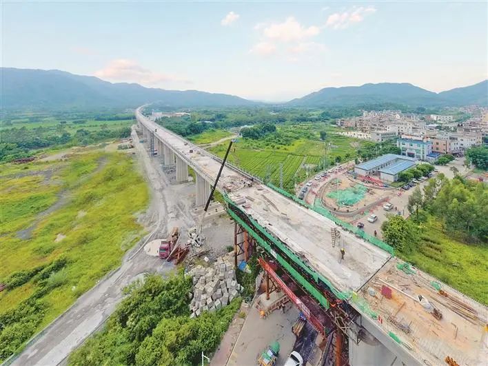 广汕铁路项目在深汕特别合作区境内全长20.67公里,主要工程有“一站七隧十桥十路基”。目前,“一站”即深汕站,正在施工站场桥墩;“七隧”、“十桥”都已全部贯通;“十路基”已全部完成施工。其中,赤石特大桥位于深汕特别合作区赤石镇,全桥长2218.96米,共计58个桥墩。