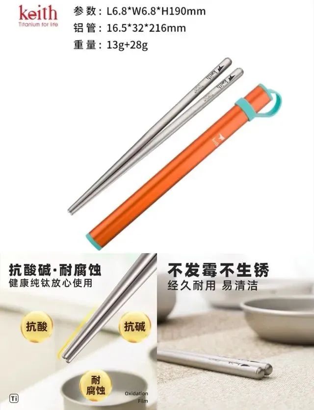给孩子换过很多便携餐具套装,最后锁定这款纯钛筷子套装,原因很简单,因为筷子抗酸碱、耐腐蚀、不发霉、不生锈,安全系数高。