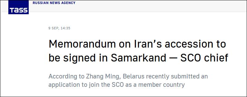 当地时间9月9日,上海合作组织秘书长张明接受俄罗斯塔斯社采访时表示,上合组织成员国元首将在撒马尔罕峰会上签署关于伊朗加入上合组织承诺的备忘录,随后伊朗将按程序完成加入上合组织工作。张明还透露,白俄罗斯最近也向上合组织提交了加入申请,另外还有很多国家希望成为该组织成员国、观察员或伙伴。