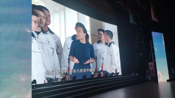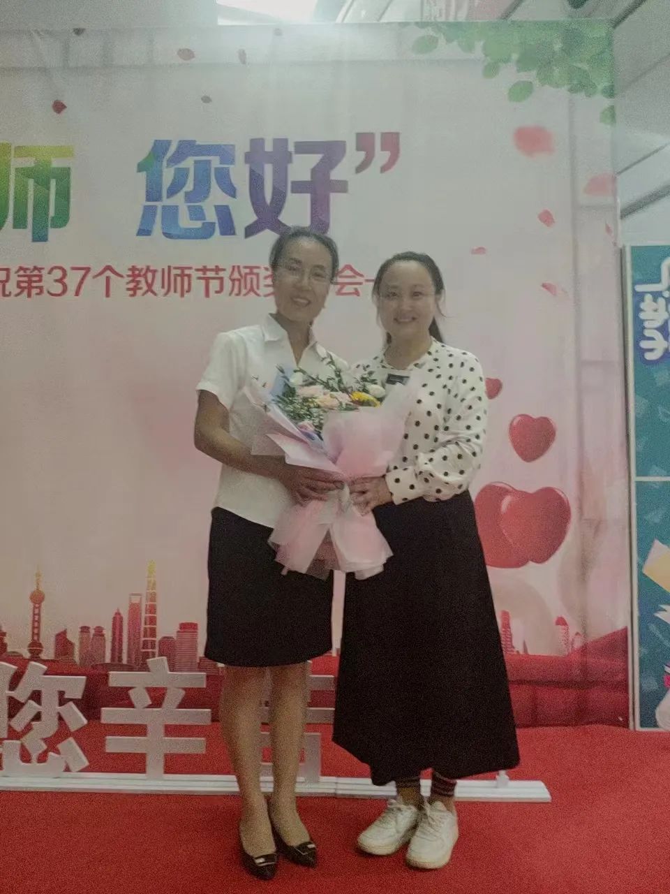 在晚会结束后我也激动万分,主动提出和老师在背景布前拍摄合影留念,回忆十几年前,赵博老师的英语课堂严肃活泼又纯正,她的发音非常标准清晰响亮,她用不输大城市的纯英语课堂教学,教给我们小城市的孩子地道的口语发音,更在我心中留下了深刻的印象。