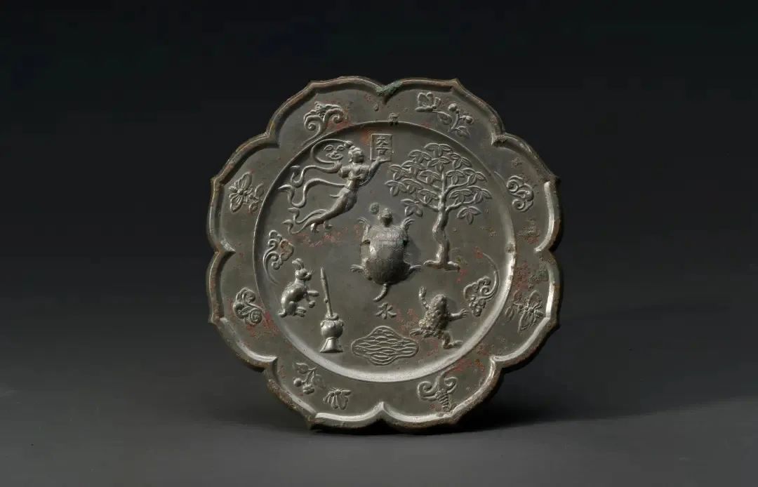 月宫故事是唐代流行的铜镜纹饰题材。在这一面唐代的月宫菱花镜上,左上方为凌空飞舞的嫦娥,体态修长,帔帛随风飘舞,与唐画中的飞天相似。她左手持“大吉”牌,右手托果盘,其下方是玉兔与杵臼,右上方有桂树,树下是跳跃的蟾蜍。桂树、嫦娥、蟾蜍、玉兔都是中国古代关于月亮的经典意象,常用来指代明月。