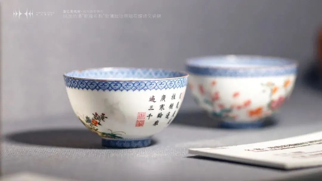 民国仿清 “乾隆年制”款薄胎珐琅釉花蝶纹诗文瓷碗(杭州博物馆藏)