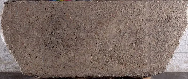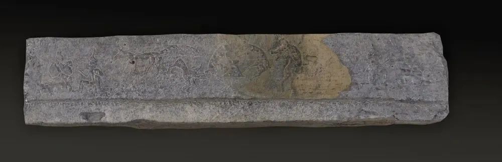 东汉日月同辉龙戏图画像石,整体呈梯形,画像石侧面雕刻的是龙戏图,底部则采取分格布局法雕了一组日月图案。大家可以看到左侧代表月亮的圆形图案中刻画了玉兔捣药和蟾蜍图案,右侧代表太阳的图案里面雕刻了金乌图案。画面采用剔地浅浮雕,局部阴浅刻,技法娴熟,画面舒展流畅,形象逼真生动。