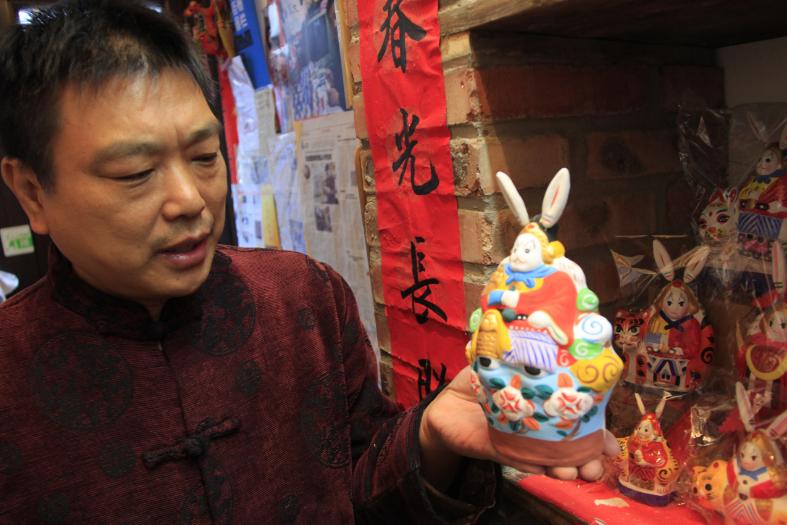 张忠强在店内展示兔儿爷(新华社 徐泽宇摄)