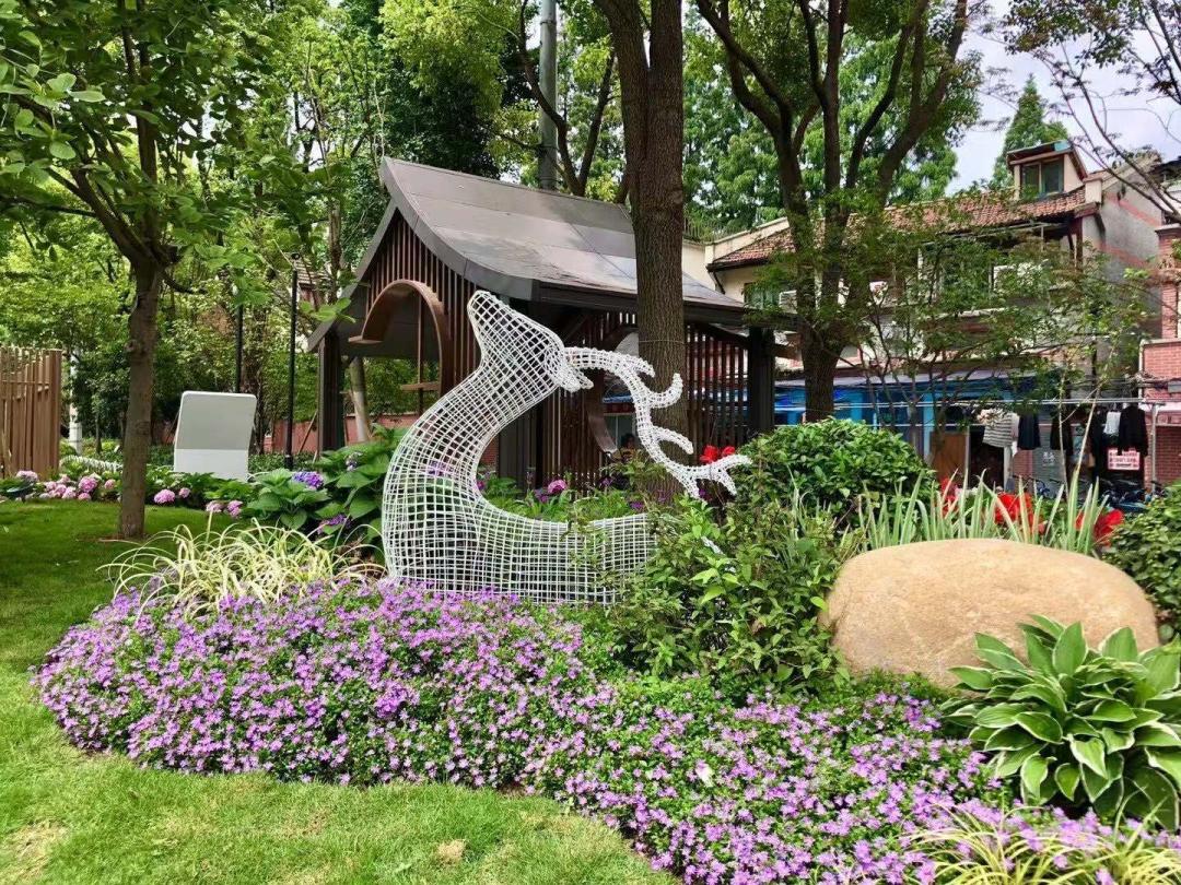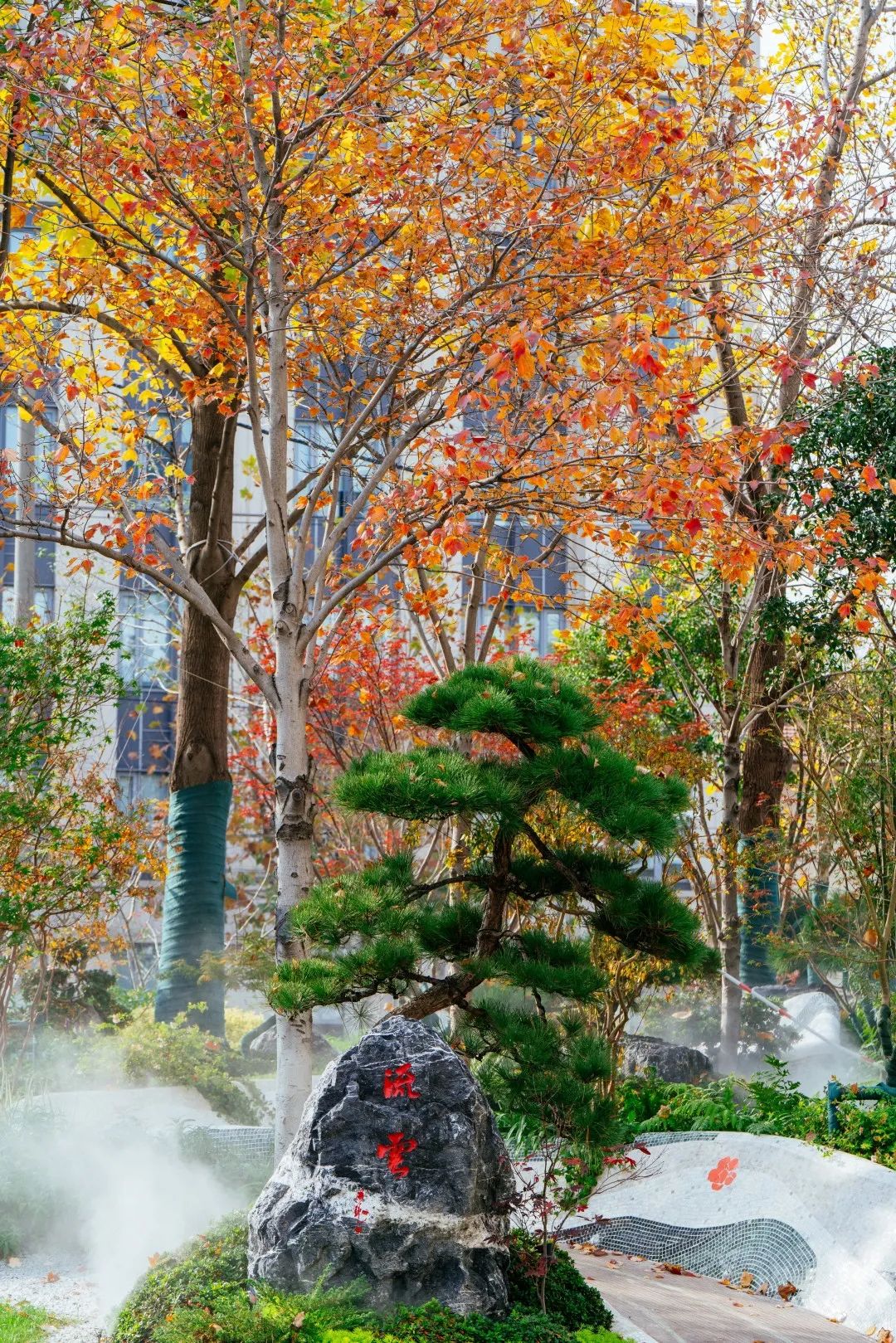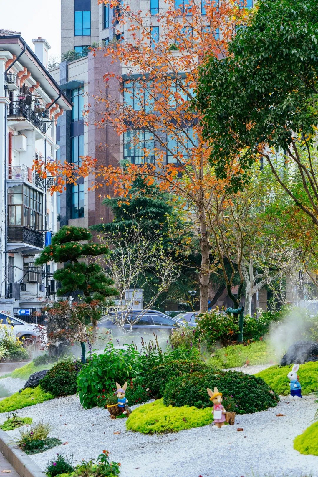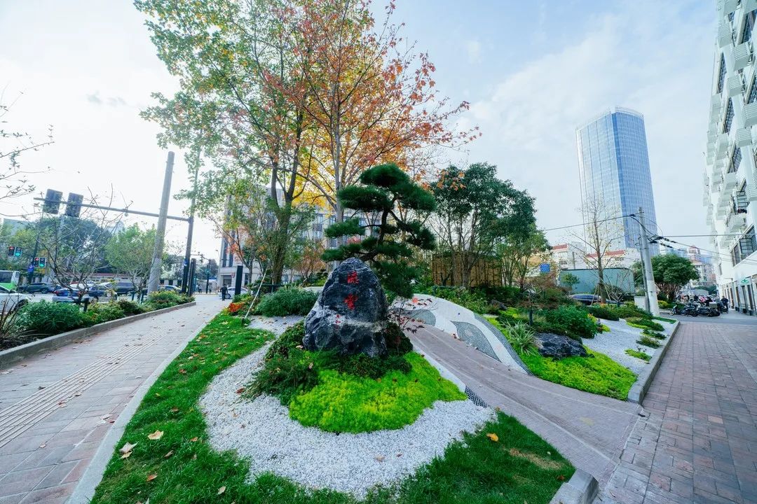 在植物上,设计方保留了场地原有的马褂木与部分槭树等色叶乔木,对其进行了整体修剪,让淮海大楼的沿街面能够更好的展现出来,重新添置一些如海棠,羽毛枫的色叶树种。地被灌木也根据上层植物搭配花境植物,根据光照条件分别布置了向阳花境、阴生花境和岛屿式花镜,给这块绿地以新的生命力。