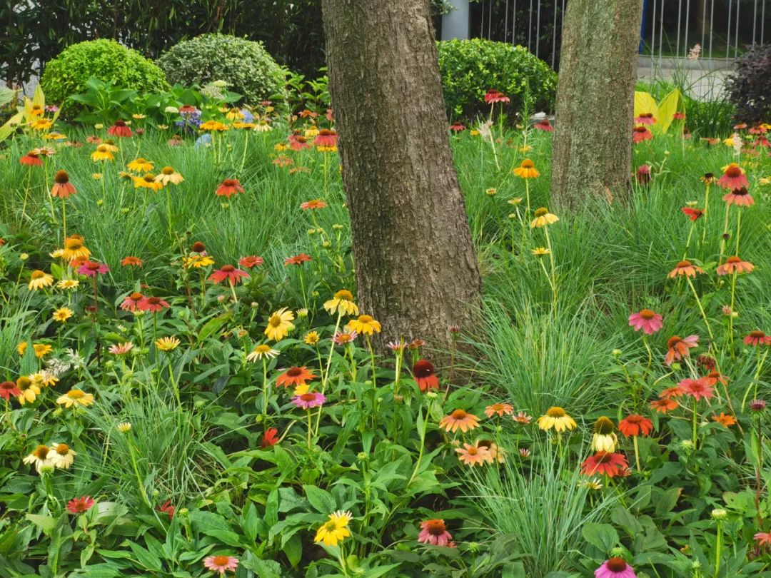 通过种植松果菊与毛冠草的混种,充分凸显现状艺术景石活泼、灵动的特色,打造橙黄色系、生机盎然的视觉花境景观。
