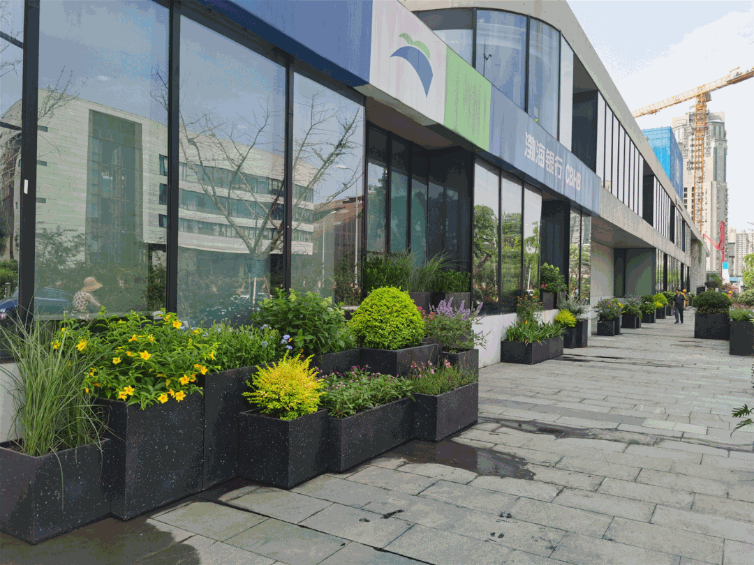 结合沿线建筑空间,在此处设置高低错落的花箱组合,选取十余类观赏植物,共同营造多层、多彩、多维的街区花园景观。