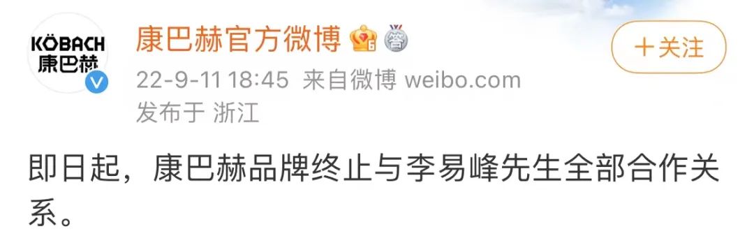 截至9月11日晚19点半,已有真果粒、京都念慈菴、HONMA高尔夫品牌、Panerai沛纳海、Prada普拉达、六福珠宝、舒适达、鸭鸭羽绒服、RemyMartin人头马、康巴赫厨具、王力安防智能锁等多家品牌宣布终止与李易峰的一切合作关系。