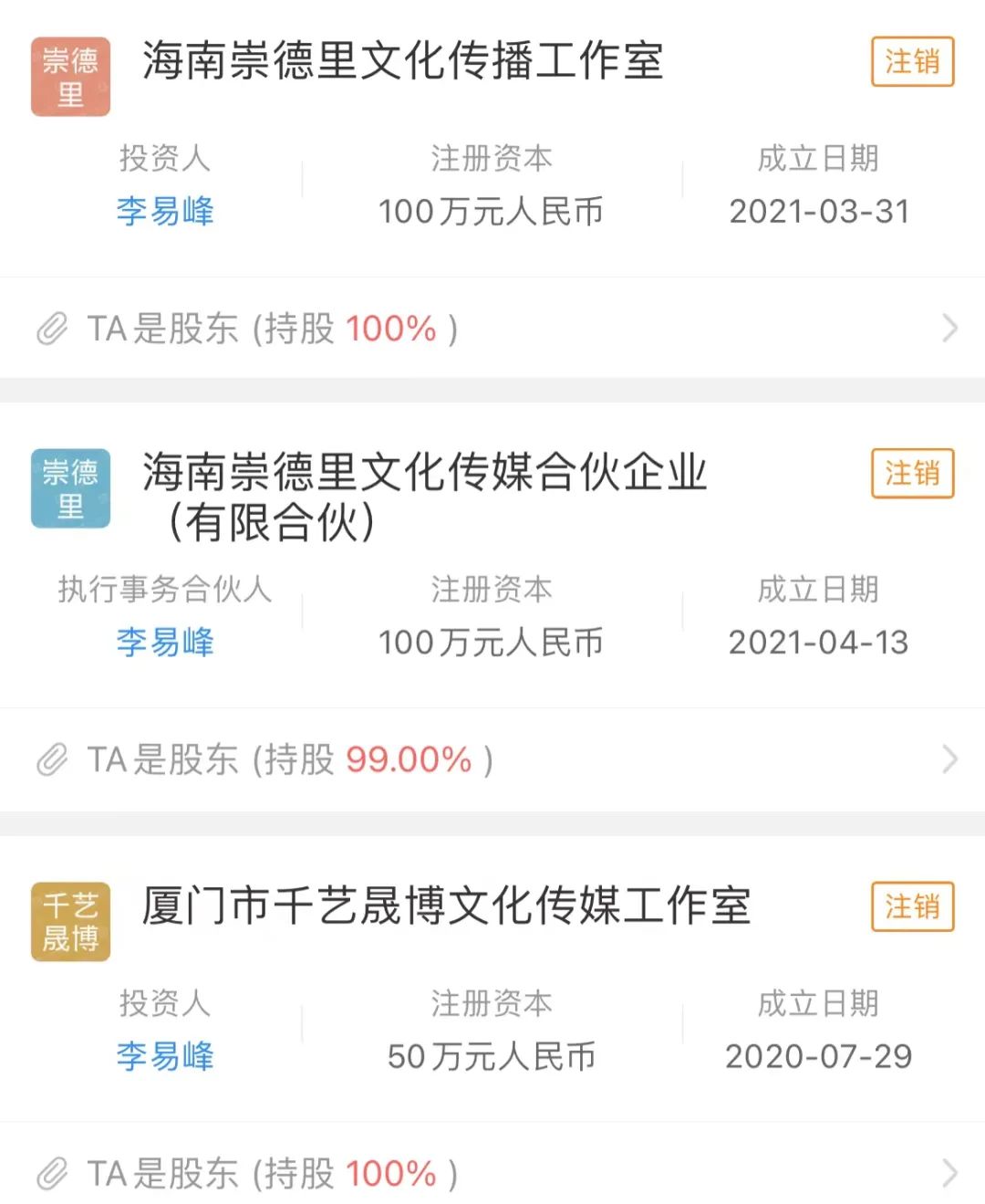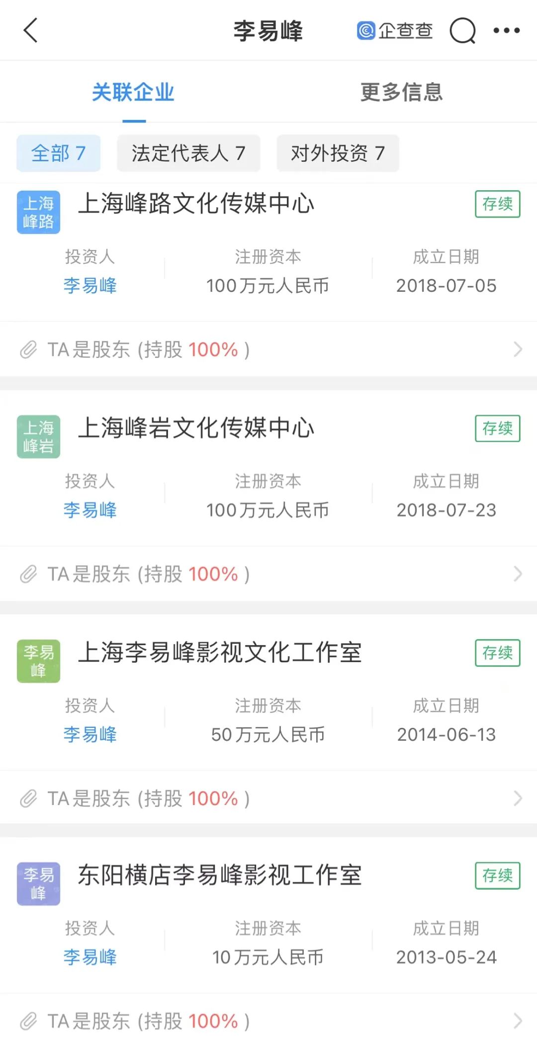 另据企查查显示,李易峰关联公司共7家,目前仅“上海峰路文化传媒中心”“上海峰岩文化传媒中心”等四家公司存续,均为李易峰个人独资。其中,东阳横店李易峰影视工作室近日被浪莎起诉侵权。