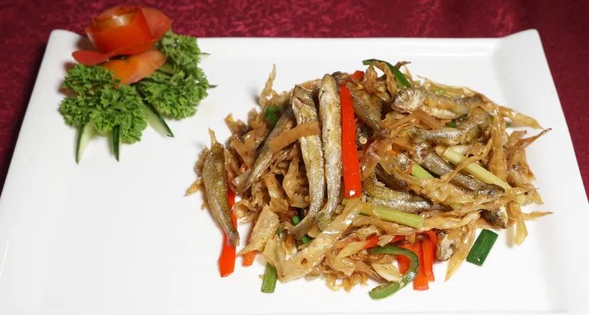 白辣椒炒鱼干选用乐昌本地特产白辣椒和山坑鱼干,将鱼干煎香捞起,放入煮出味的白辣椒水中,加入配料焖透炒匀,口味香辣浓郁,极具特色。
