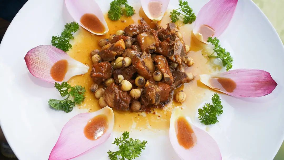 客家莲香排骨制作选用始兴本地天然莲子和本地猪排骨,洗净、焯水、调味焖煮后再蒸,排骨香甜,莲子酥糯,是一道老少咸宜的养生菜肴。