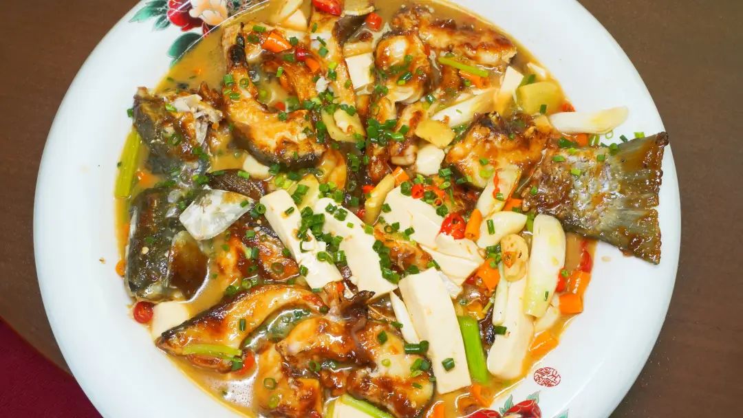 这道菜要选用南雄草鱼、南雄黄辣椒及本地水豆腐,用姜葱将鱼肉煎香,再加入豆腐、辣椒一同烹煮,鱼肉入味而不烂,鱼汤鲜香带辣,风味十足,令人回味。