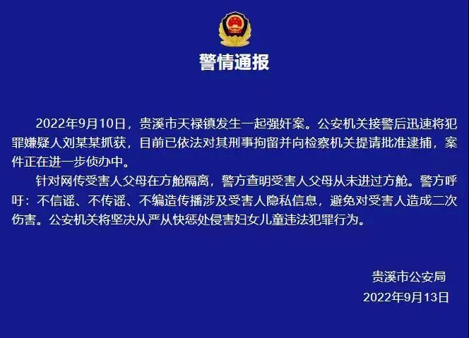 刚刚,贵溪市公安局发布警情通报称,2022年9月10日,贵溪市天禄镇发生一起强奸案。公安机关接警后迅速将犯罪嫌疑人刘某某抓获,目前已依法对其刑事拘留并向检察机关提请批准逮捕,案件正在进一步侦办中。