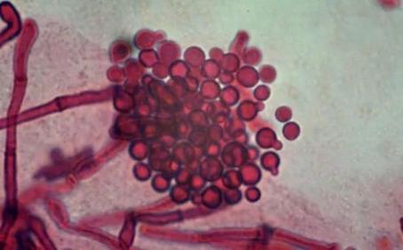 (显微镜下花斑癣皮损处的孢子和菌丝)