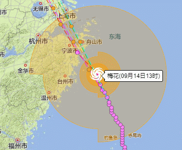 今天下午1点,强台风“梅花”最大风力:15级, 48米/秒(约173公里/小时) ,距离浙江省象山县东南方向约125公里,“梅花”将以每小时20-25公里的速度向西北方向移动,强度维持或略有增强。