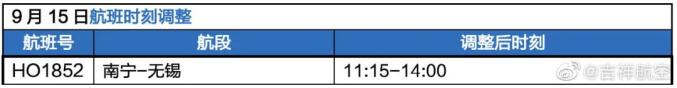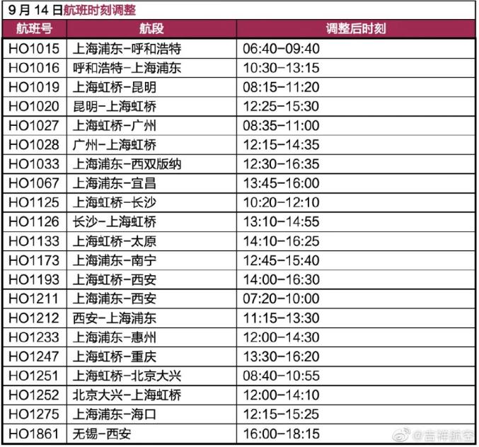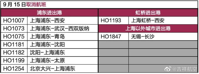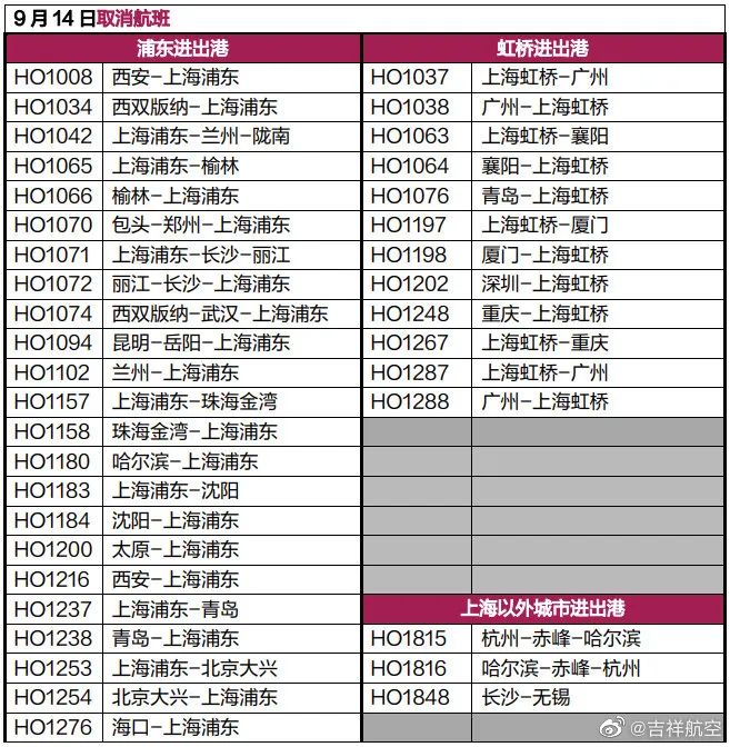 受今年第12号台风“梅花”影响,为确保航空运行安全,吉祥航空调整9月14日、15日部分航班。截止目前具体取消情况如图。