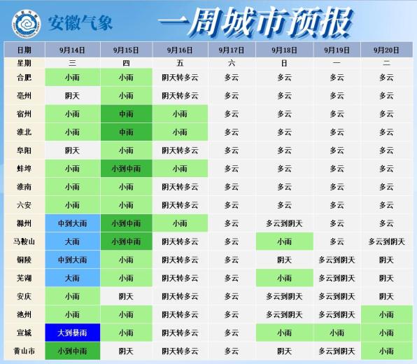 14日(周三):淮北地区多云转阴天,东部有小雨,局部中雨;沿淮淮河以南阴天大部分地区有小雨,东部地区中到大雨,局部暴雨。