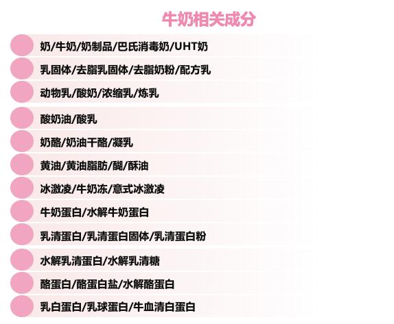 并且需要对明确为过敏原的所有食物进行完全的回避,选择无敏辅食,保障婴幼儿正常生长发育[1]。以牛奶为例,牛奶中主要的过敏原是乳清蛋白和酪蛋白,在选购辅食时应注意食物标签,标签中含以下成分均为牛奶相关成分[5]。