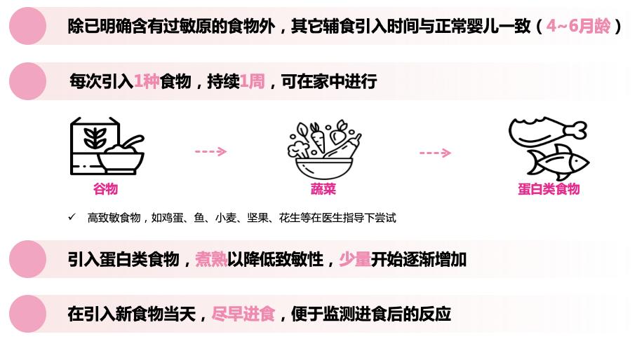 在4-6个月辅食添加窗口期应尽可能进行辅食添加,保证摄入新食物(非过敏食物)的多样性,确保患儿的营养摄入。建议选择无敏辅食,保障婴幼儿正常生长发育。