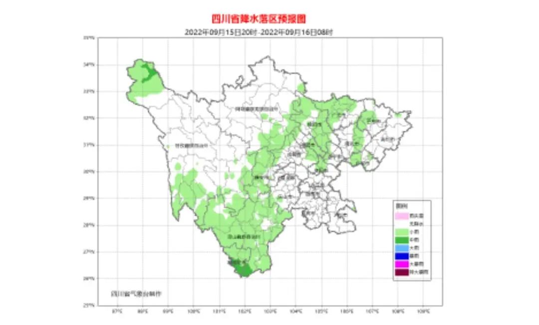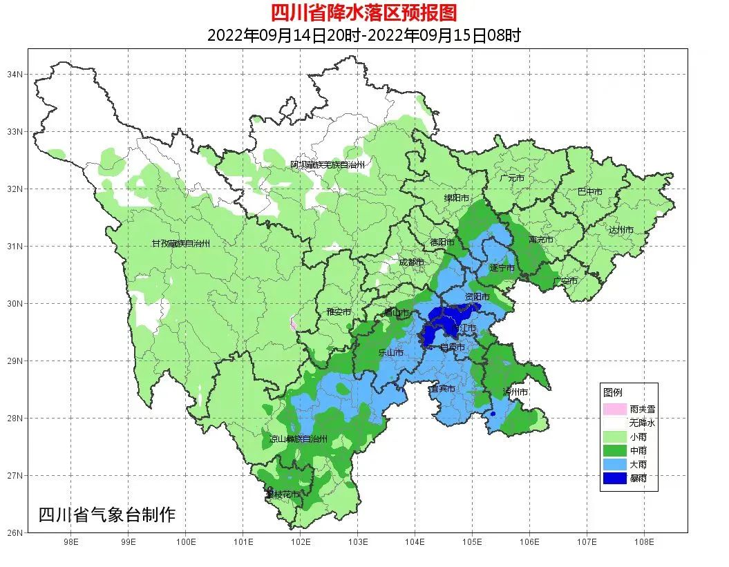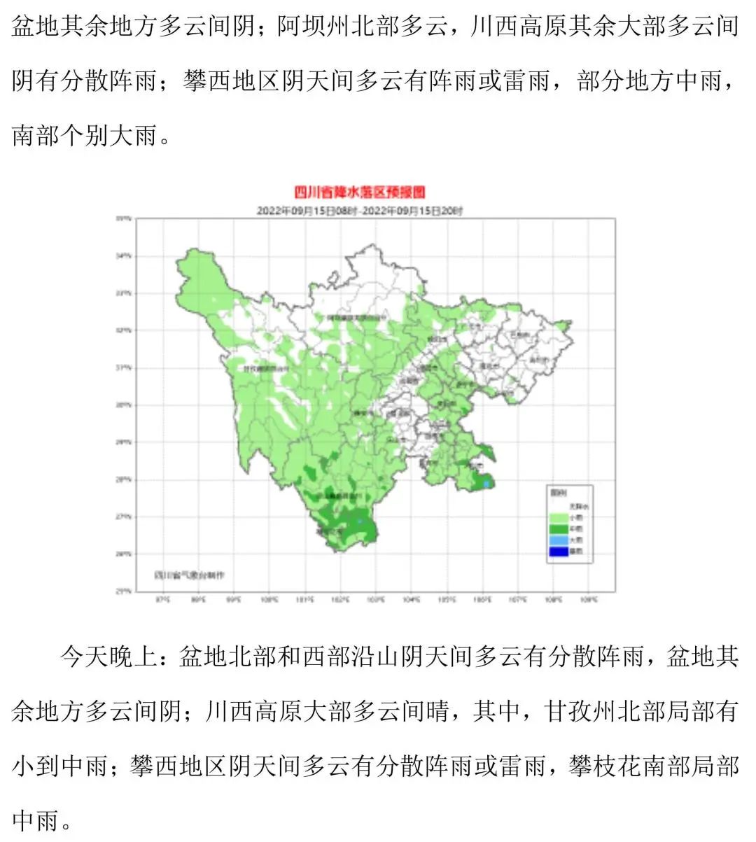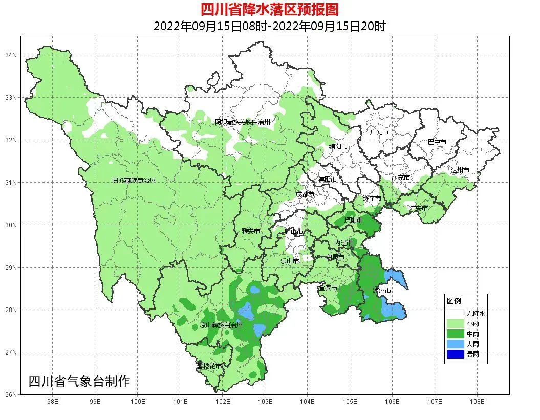据四川省气象台,9月14日20时至9月15日20时,盆地大部阴天有阵雨或雷雨,雨量小到中雨,其中宜宾、泸州、自贡、内江、资阳、遂宁6市和乐山、眉山、成都、德阳、绵阳5市东部以及南充南部有大雨,局部暴雨;川西高原北部多云间阴有分散阵雨或雷雨,南部阴天间多云有阵雨或雷雨,其中甘孜州南部局部地方有中雨;攀西地区阴天中到大雨,局部暴雨。