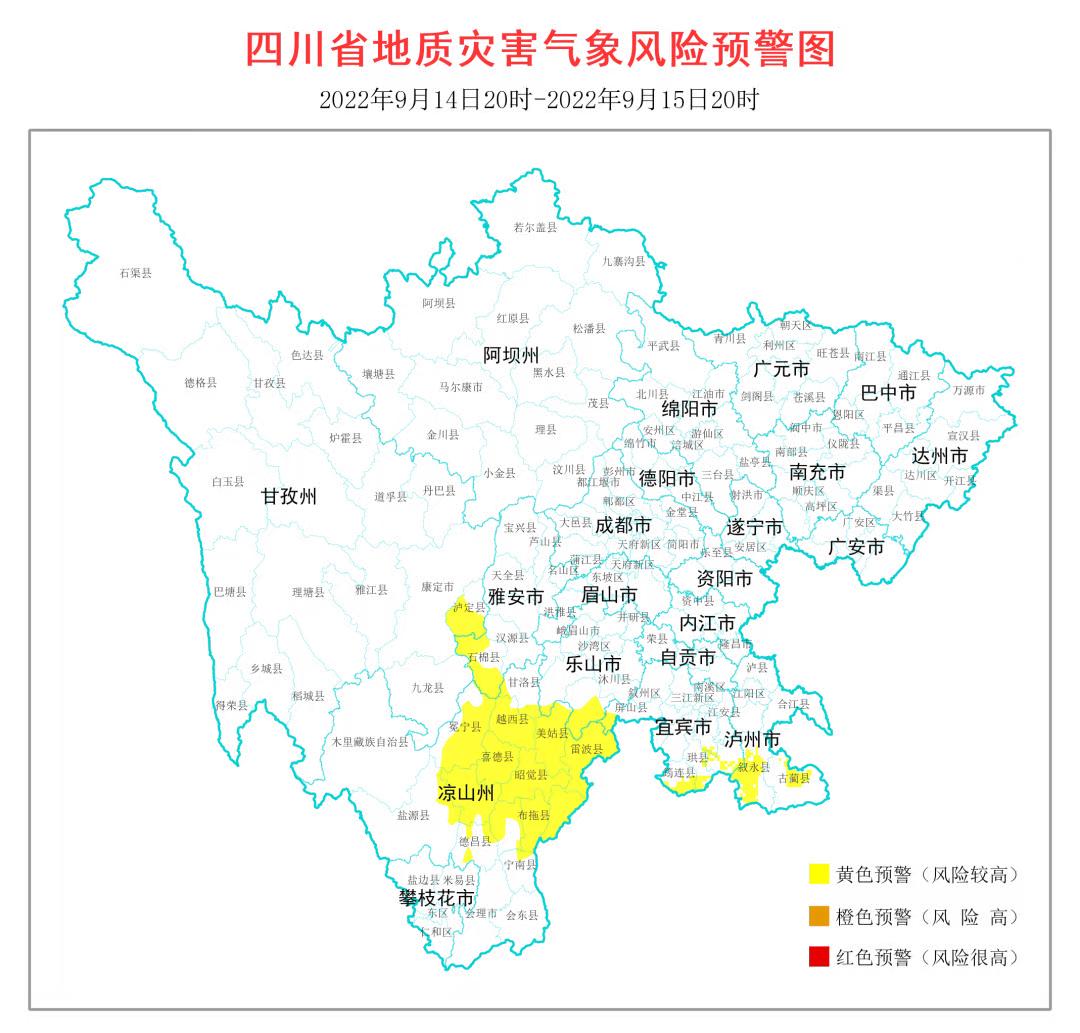 四川省地质灾害指挥部办公室发布9月14日20时至9月15日20时 ,全省地质灾害气象风险3级黄色预警。此次预警区域为:宜宾市屏山县、长宁县、珙县、筠连县、兴文县,泸州市叙永县、古蔺县,雅安市石棉县,乐山市峨边县、马边县,甘孜藏族自治州泸定县、九龙县,凉山彝族自治州西昌市、盐源县、德昌县、宁南县、普格县、布拖县、金阳县、昭觉县、喜德县、冕宁县、越西县、甘洛县、美姑县、雷波县等26个县市区。(成都日报锦观新闻)