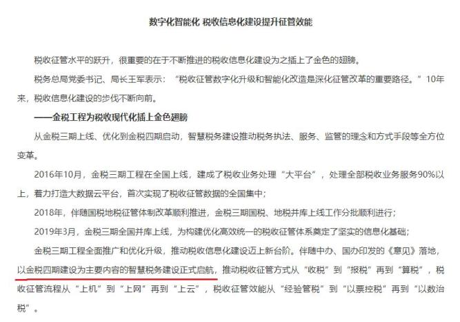 10. 随着金税四期的快速推进,预计将会构建更强大的现代化税收征管系统,实现全国范围内税务管理征收业务的通办,实现“税费”全数据全业务全流程全数据“云化”打通,进而为智能办税、智慧监管提供条件和基础。