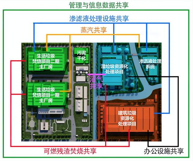 天马园区在能源、资源上实现协同共享:湿垃圾处理厂初期调试所需蒸汽及冬天自产蒸汽不足部分,由焚烧厂蒸汽进行补充;建筑垃圾分选出的可燃物及湿垃圾分选出的残渣,直接运输至焚烧厂进行协同焚烧;天马焚烧厂二期渗滤液、建筑垃圾车间冲洗废水进入湿垃圾污水处理系统;湿垃圾资源化处理厂污水处理系统产生的浓缩液,回喷至焚烧厂焚烧炉处理;焚烧厂一期渗沥液处理产生的沼气进入湿垃圾厂沼气预处理系统,最终利用沼气发电机发电;湿垃圾处置过程中产生的高浓度臭气,引至焚烧厂二期垃圾坑进行焚烧处理。