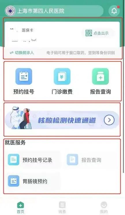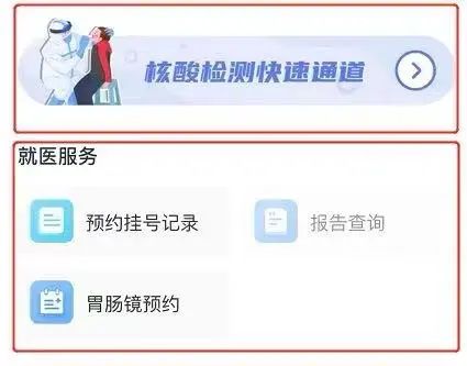 该模块集成了胃肠镜预约、核酸检测快速通道等常用服务,患者无需到院即可开具检查单,并预约到院检查时间。