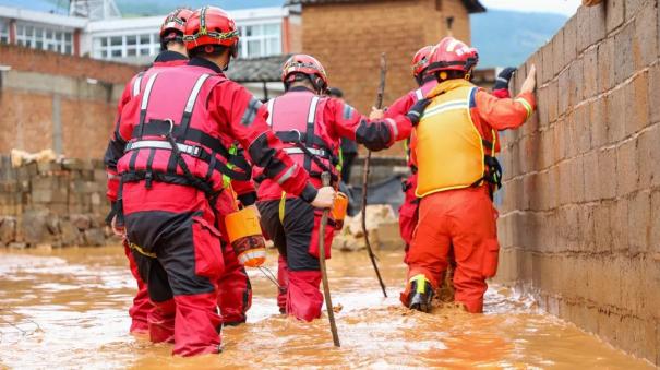 支队指挥中心调派泸西大队4 车23人1艇作为首批出动力量前往县城、村庄各灾情点核查灾情并开展救援。