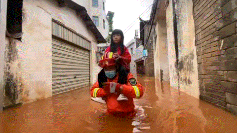 参加救援的消防指战员立即上前安慰老人,“老人家,不用怕!我们接您去安全的地方!”“奶奶,我先送您出去!”消防指战员们蹲下身子,背起老奶奶,另外一名队员在后面扶着老奶奶,蹚着齐腰的洪水,小心翼翼向二楼转移。