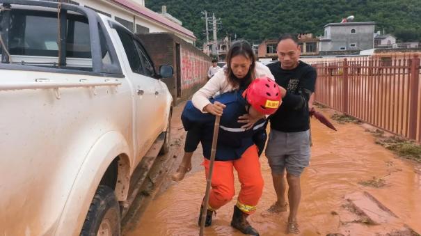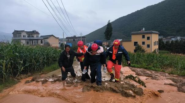 16日中午12时15分,增援队伍的蒙自、弥勒大队接到前方指挥部调警赶赴中枢镇受灾最重的大雨龙村开展救援行动。