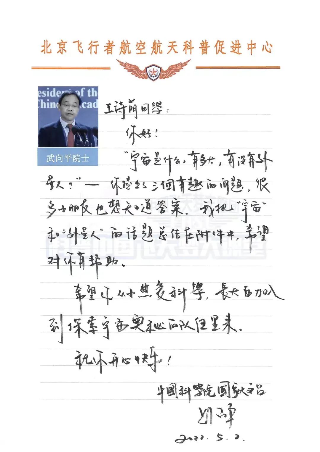 院士回复鼓舞“小小航天迷”