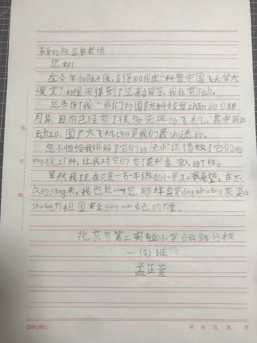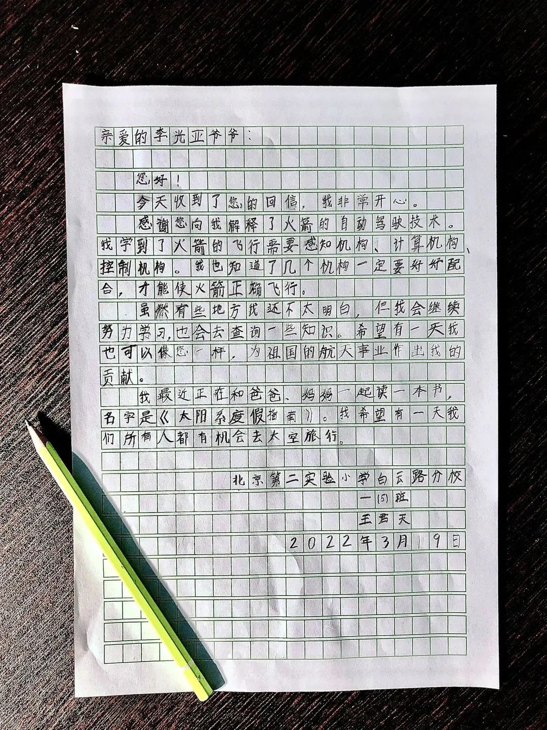 一年级的王君天一直有个疑惑:“火箭上没有驾驶员,它的正确飞行是怎么控制的?”在得到中国运载火箭技术研究院原党委副书记李光亚的权威解答后,小朋友用稚嫩的笔触和话语表达了对专家爷爷的感激之情。