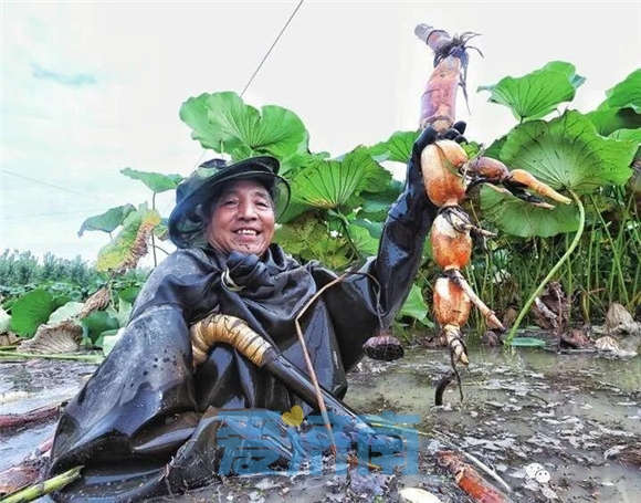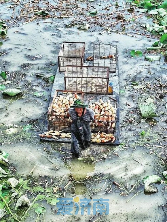 “夏天入火锅,冬天进冰窖”,这是挖藕生活的真实写照,藕农生活的艰辛不言而喻。8月19日下午2点,70岁的赵广法与62岁的郑锁林老人头顶烈日,身着防水皮裤在藕田里加紧采挖。郑锁林手拿水枪匍匐在泥塘中将藕根上的泥冲洗下来,熟练地将一根根多节莲藕“拔”出来,头上虽不断渗出汗水,但是脸上露出了笑容。这是他从事挖藕工作的第50个年头,老家是白洋淀的他挖了大半辈子藕,平均一天在水里泡10小时。