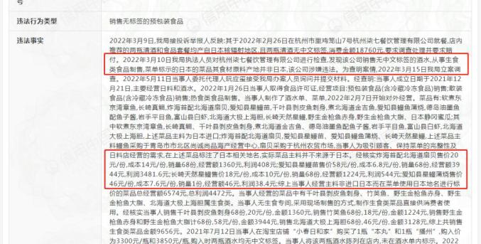 处罚事由显示,今年3月,执法人员接到举报人反映,其于2022年2月26日在杭州市里鸡笼山7号杭州柒七餐饮管理有限公司就餐,店内推荐的两瓶清酒和食品均产自日本核辐射地区,且两瓶清酒无中文标签,消费金额18760元。