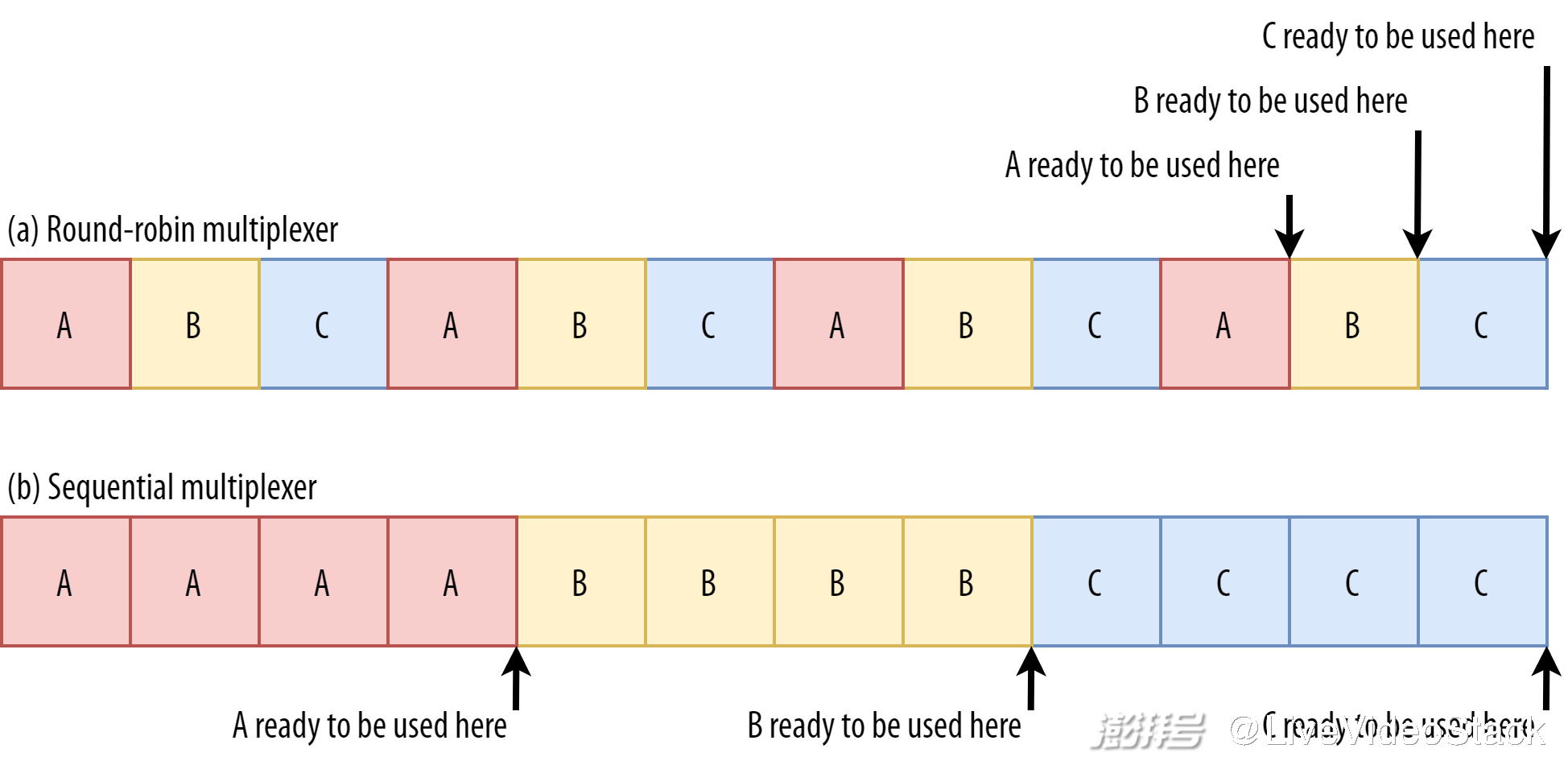比如,对数据流A、B和C来说,我们可能会看到ABCABCABCABCABCABCABCABC这样的数据包序列,其中我们可以更改每个数据包中的活跃数据流[我们称之为轮询(round-robin)]。