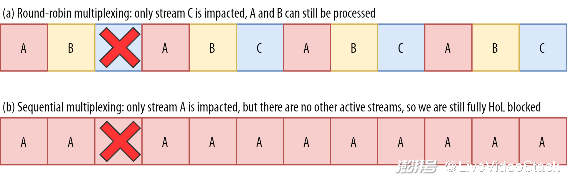 我们在第一部分曾讨论过,单个TCP丢包会导致多个传输中资源数据的延迟,这是因为TCP的字节流认为所有数据都属于单一文件。而QUIC非常清楚存在多个并发字节流,并能在每个字节流的基础上处理丢包。然而,正如我们所看到的,这些字节流并没有真的在并行传输数据,而是流数据被多路复用到单一连接上。这种多路复用可以有多种方式实现。