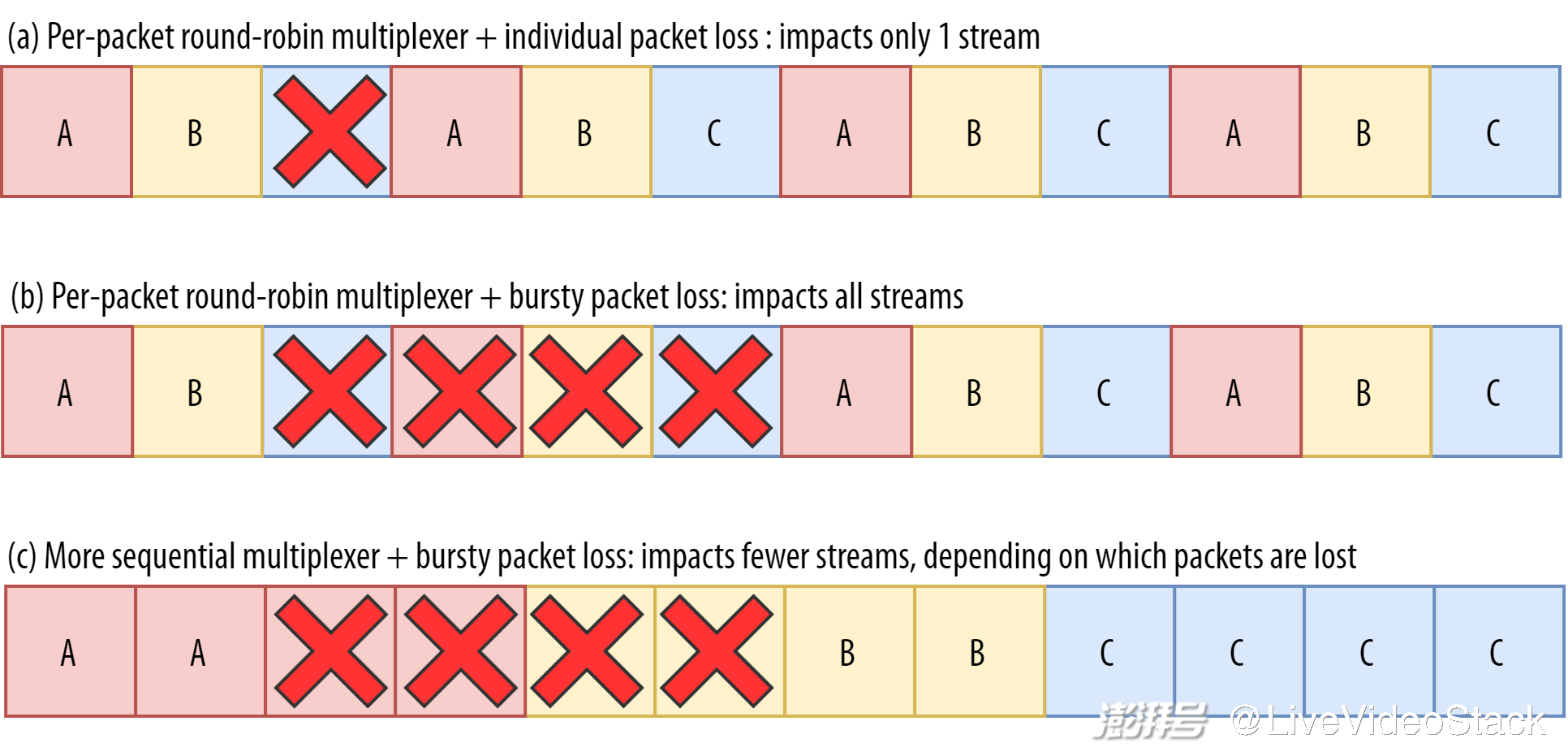 图7 丢包影响取决于使用的多路复用器(注意我们假设每个数据流所发送的数据都比之前类似的图片中的多)