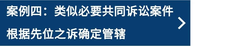 第二,必要共同诉讼应根据不同情况适用共同诉讼管辖条款。对于固有必要共同诉讼及类似必要共同诉讼中属于连带责任类型的案件,原则上可适用共同诉讼管辖条款确定管辖法院,即受诉法院对其中任一被告有管辖权的,即可对全案行使管辖权。然而,当类似必要共同诉讼中各诉之间存在主从关系或后诉以先位之诉为前提时,应根据先位优先原则适用共同诉讼管辖条款,即由主位或先位之诉确定全案管辖。